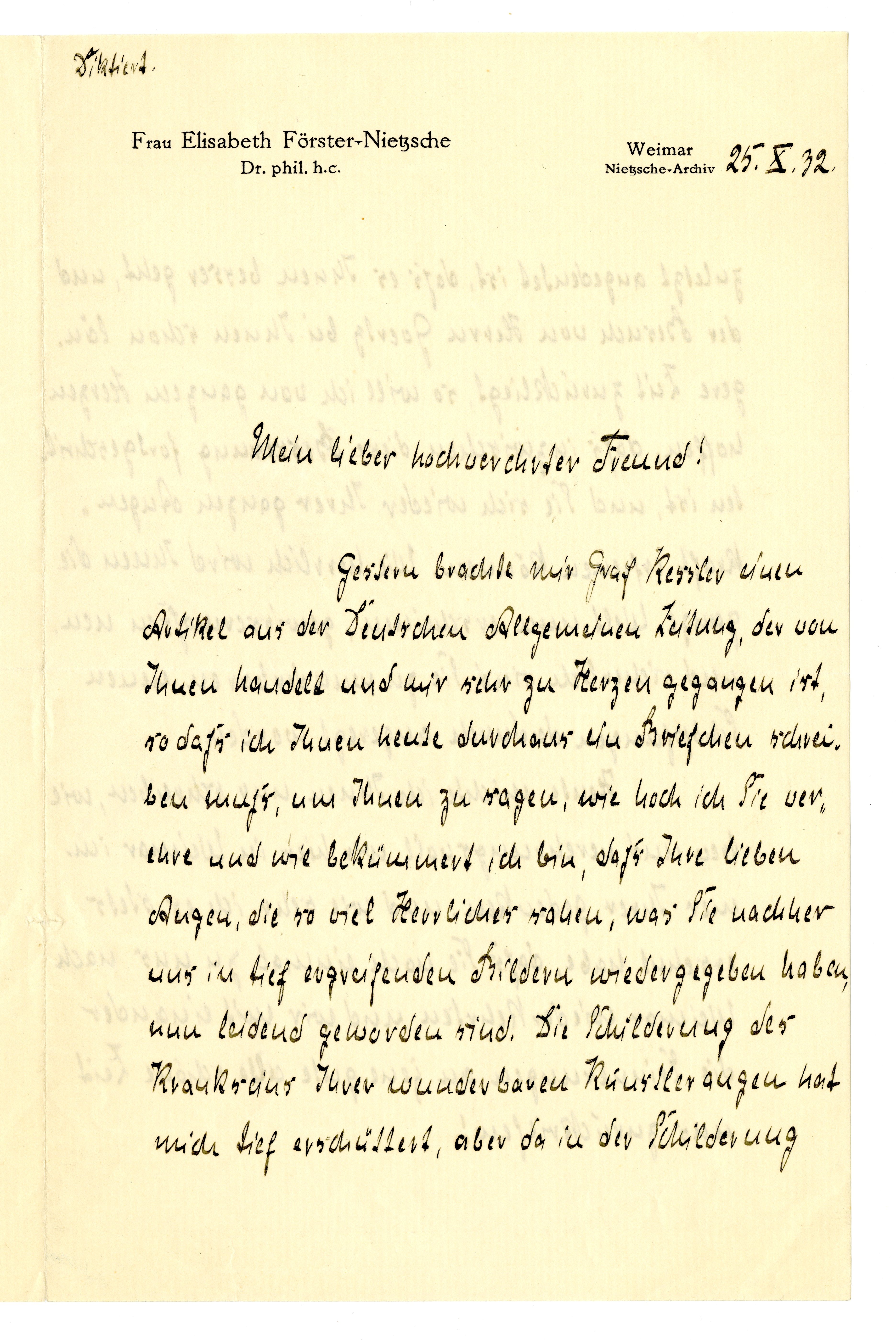 MM K 2975, Munchmuseet. Datert 25.10.1932. Brev fra Elisabeth Förster-Nietzsche, Nietzsche-Archiv.
