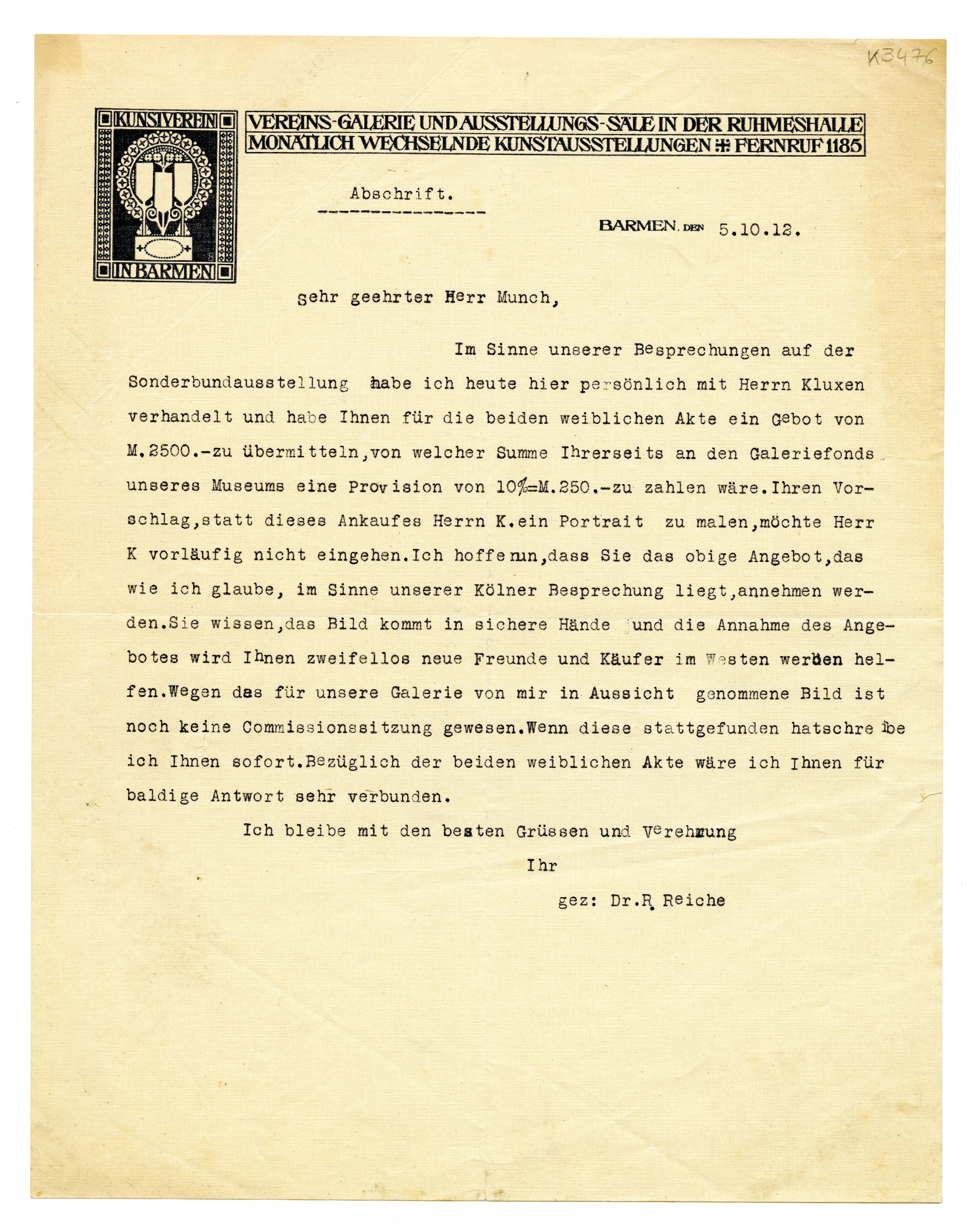 MM K 3476, Munchmuseet. Datert 05.10.1912. Brev fra Richard Reiche, Kunstverein in Barmen.