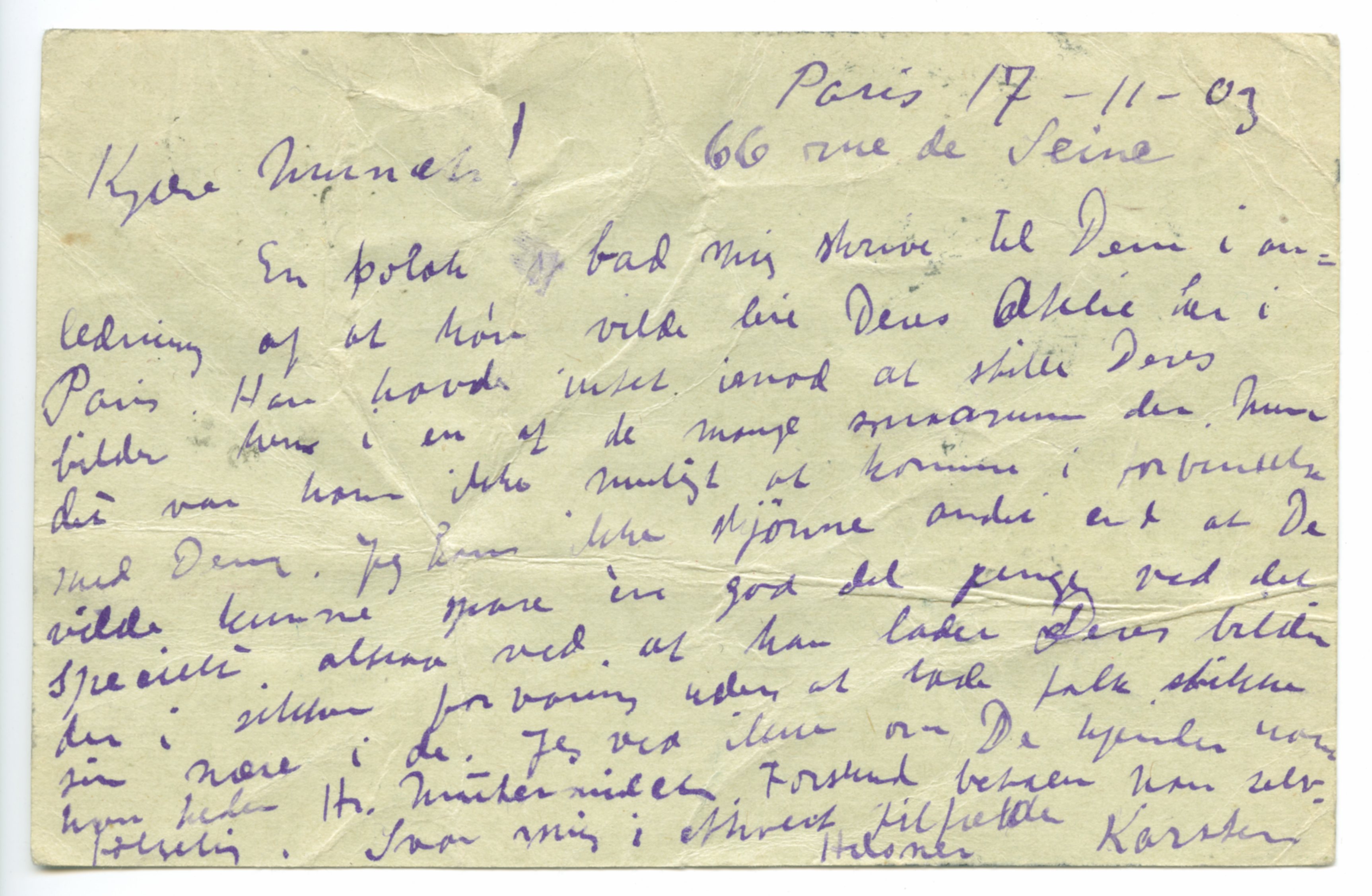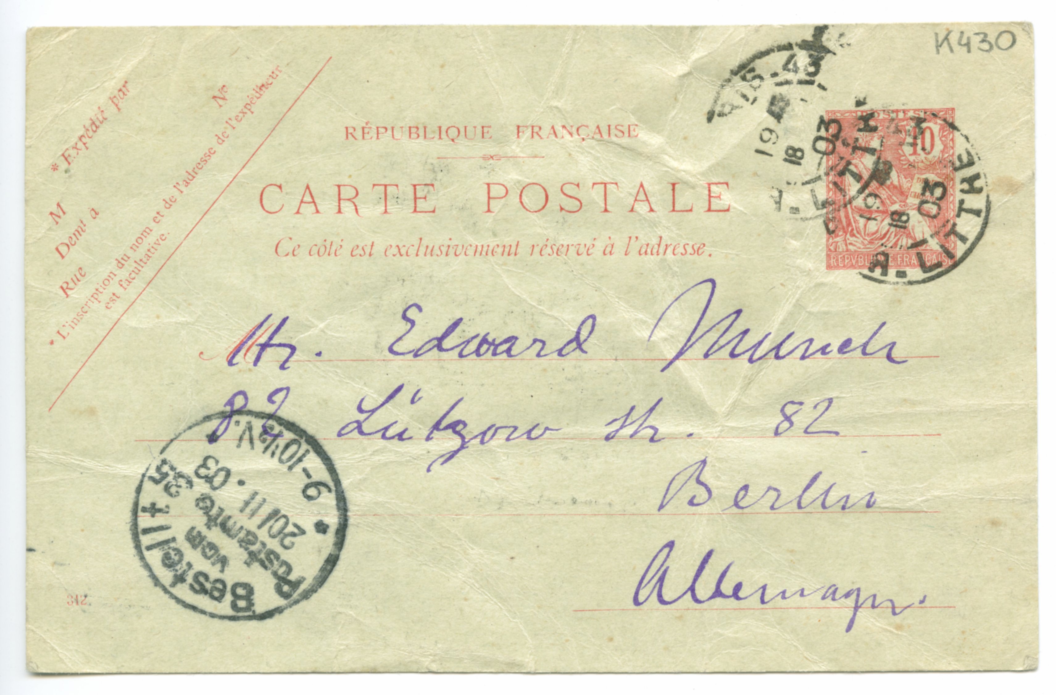 MM K 430, Munchmuseet. Datert 17.11.1903. Brev fra Ludvig Karsten.