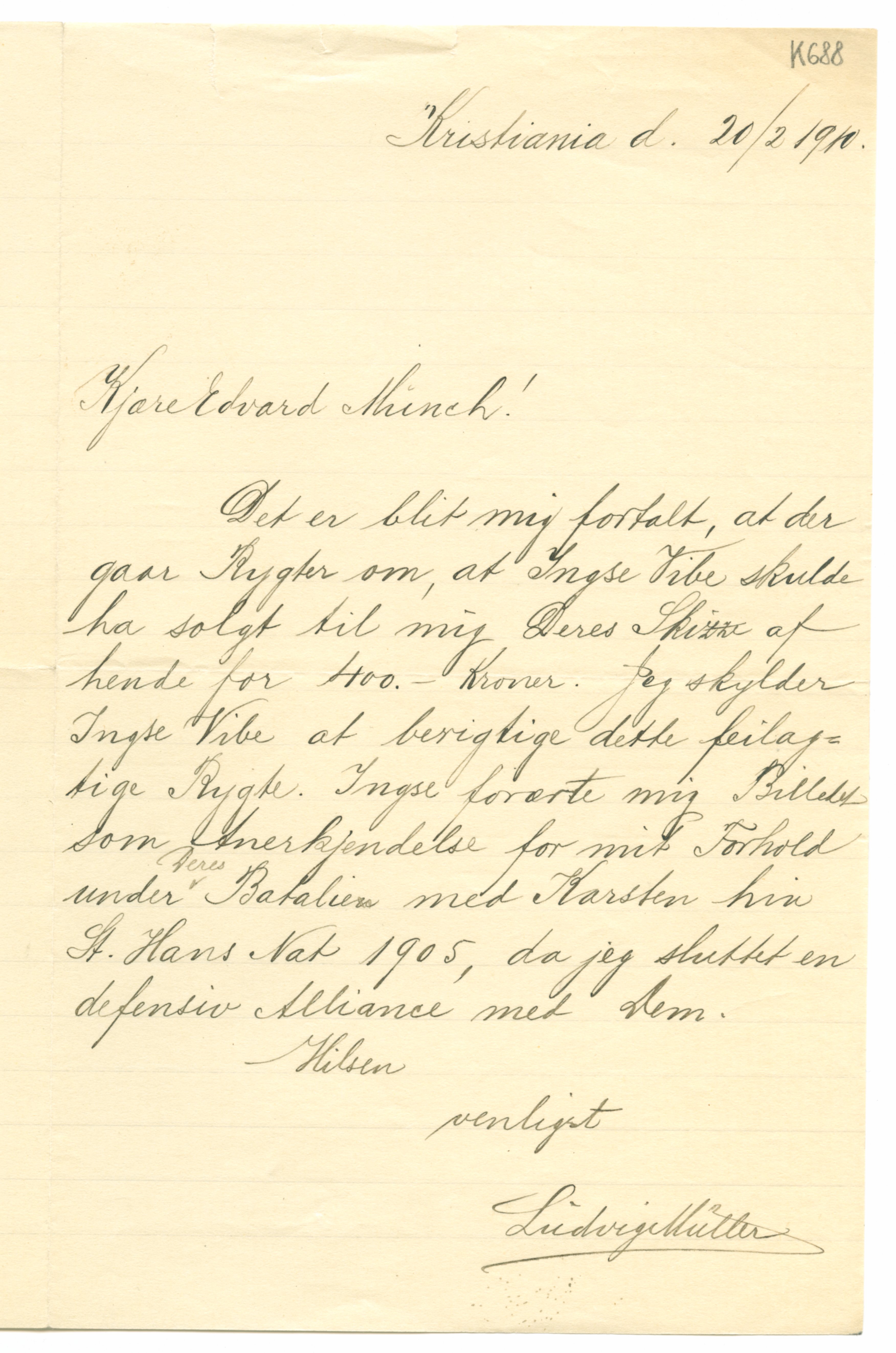 MM K 688, Munchmuseet. Datert 20.02.1910. Brev fra Ludvig Müller.