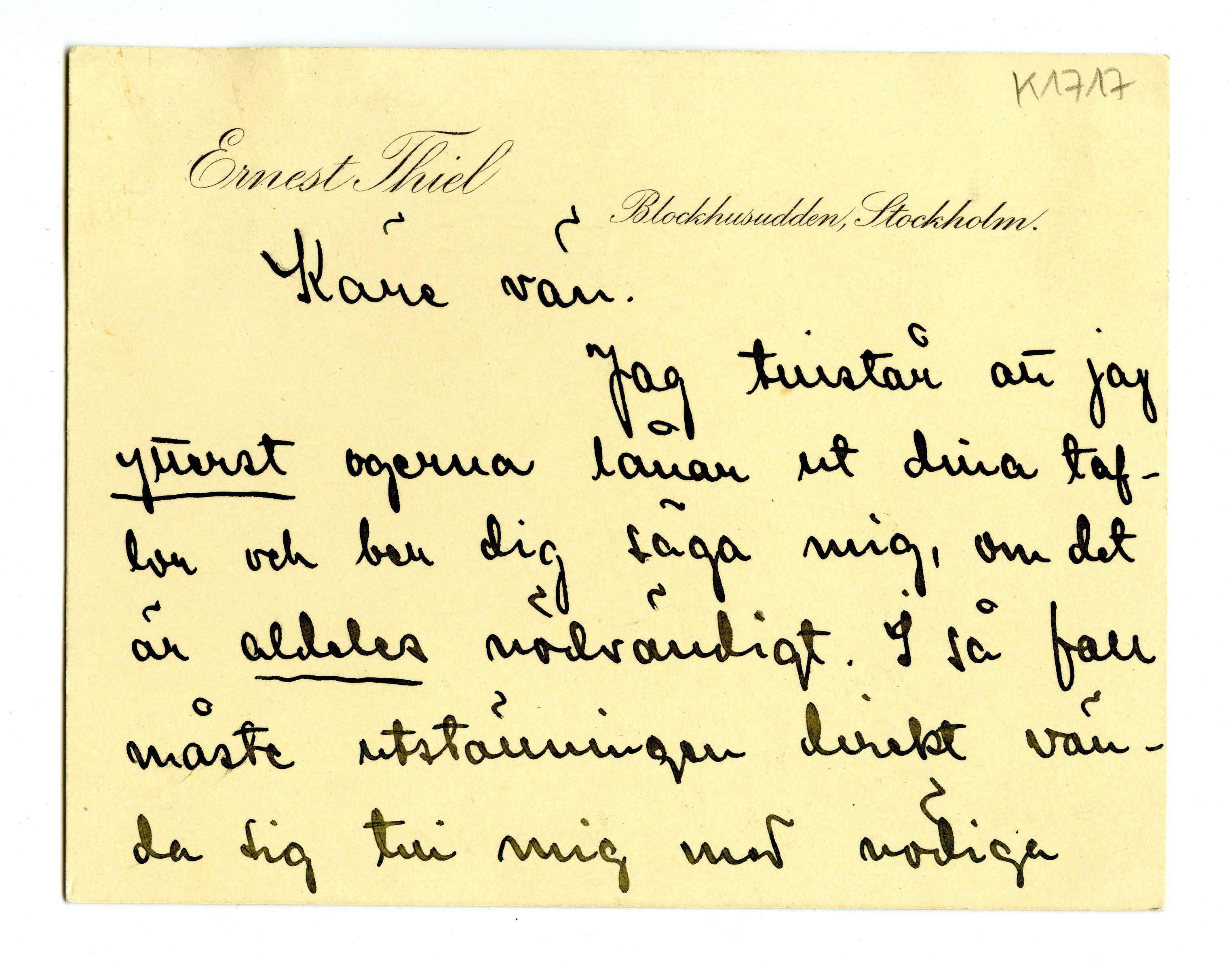MM K 1717, Munchmuseet. Ikke datert. Brev fra Ernest Thiel.