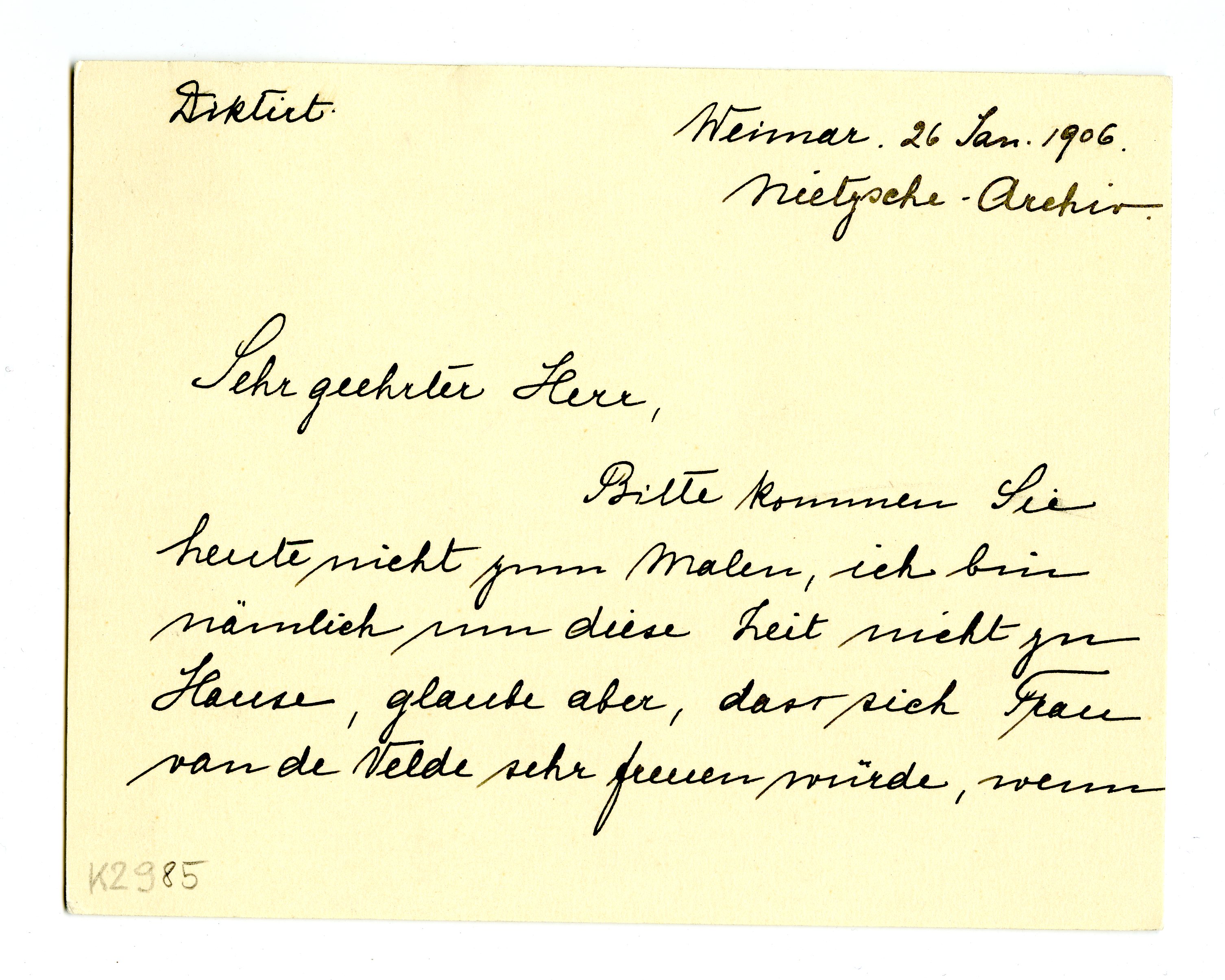 MM K 2985, Munchmuseet. Datert 26.01.1906. Brev fra Elisabeth Förster-Nietzsche, Nietzsche-Archiv.