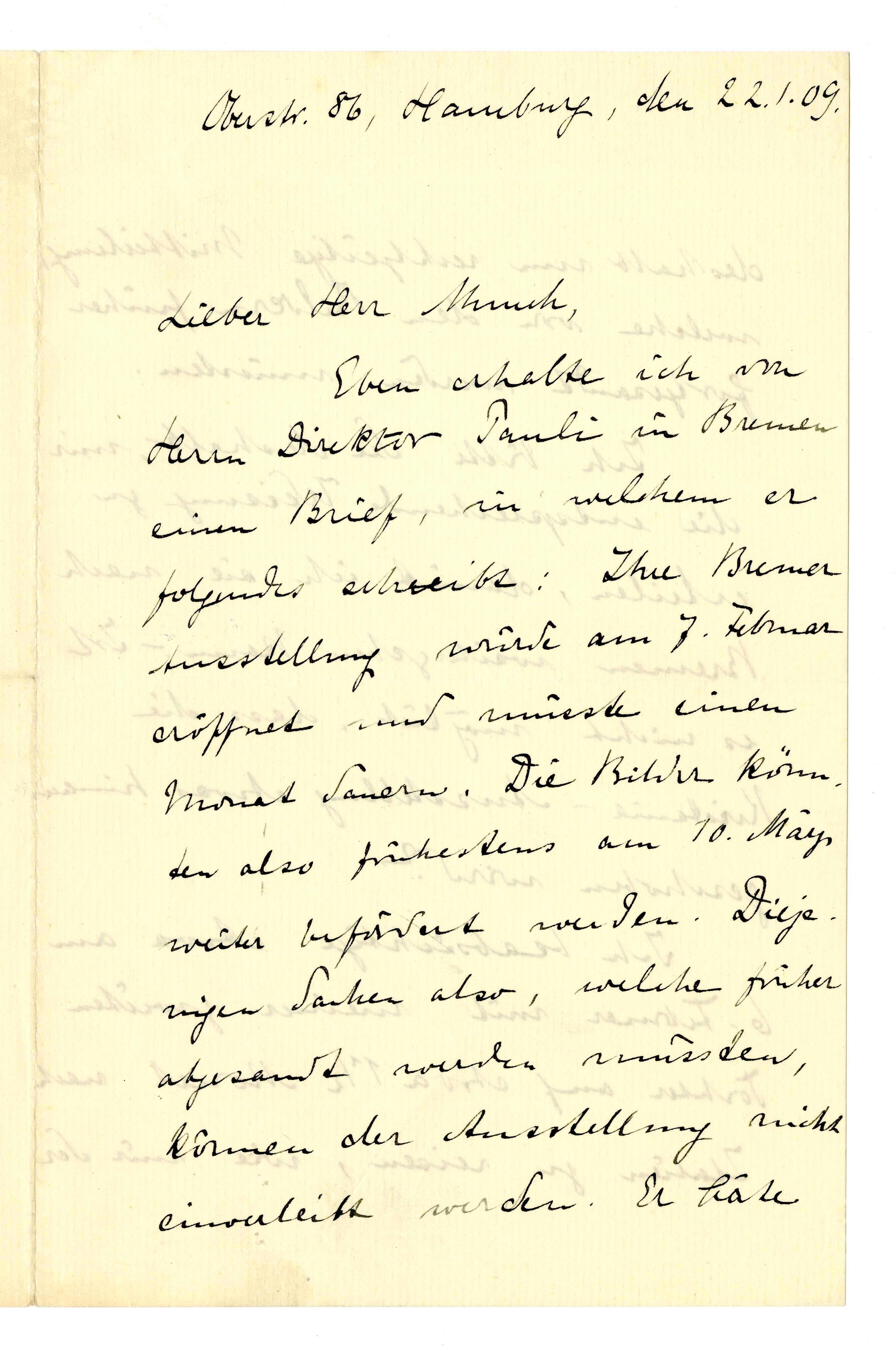 MM K 3156, Munchmuseet. Datert 22.01.1909. Brev fra Gustav Schiefler.