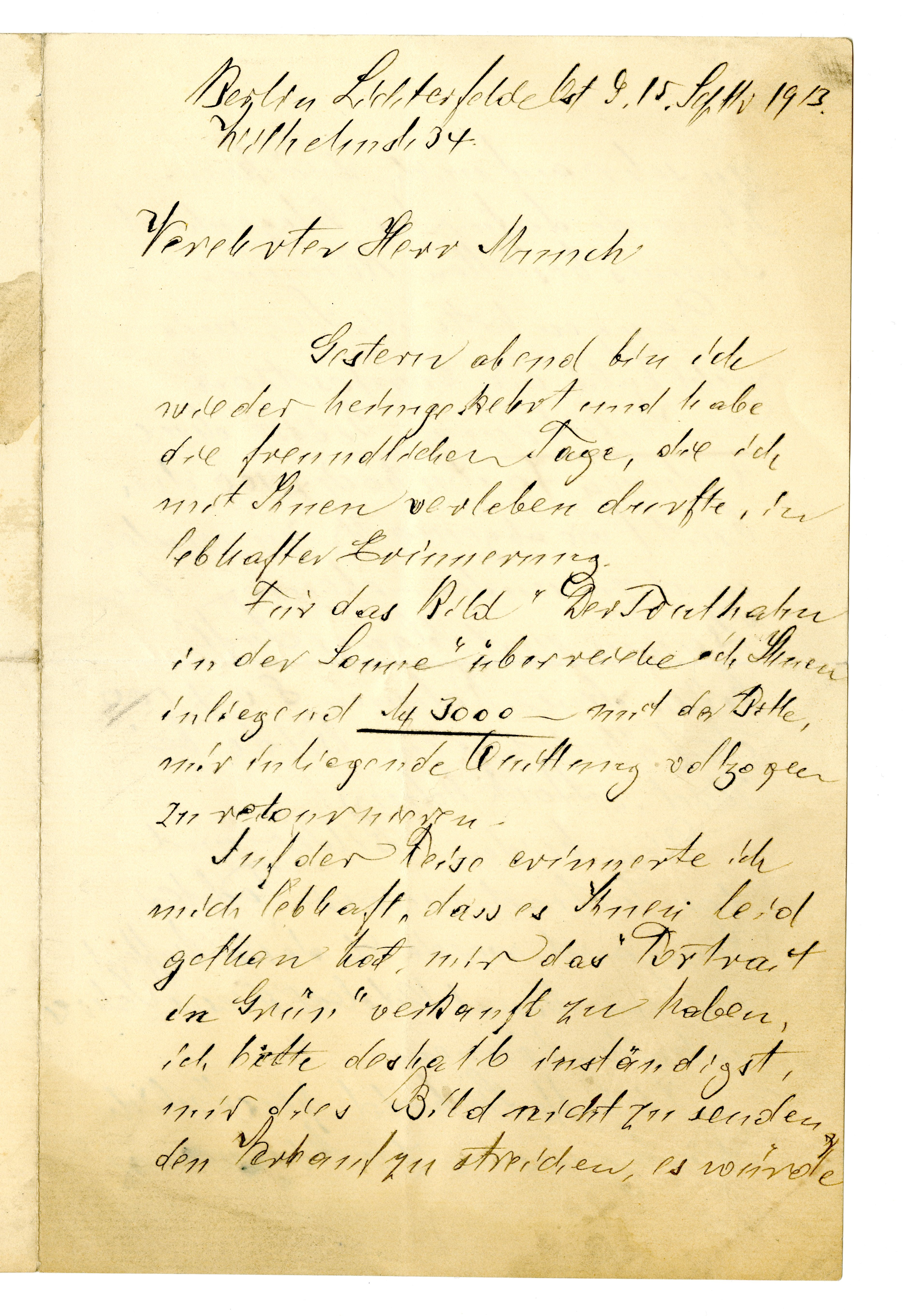 MM K 3359, Munchmuseet. Datert 15.09.1913. Brev fra Carl Steinbart.
