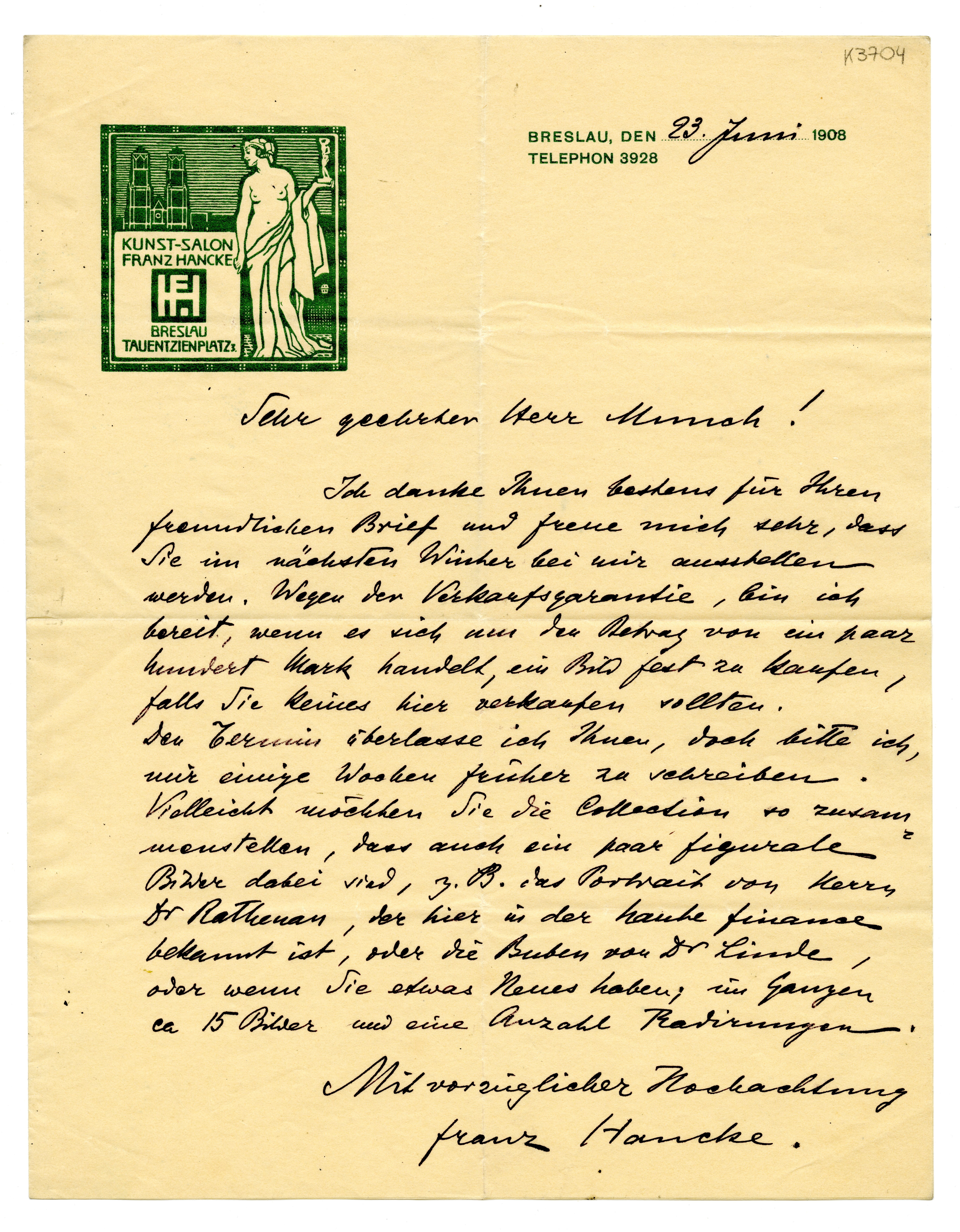 MM K 3704, Munchmuseet. Datert 23.06.1908. Brev fra Franz Hancke, Kunst-Salon Franz Hancke.
