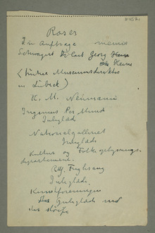 «Roser ‹{ … }Zü›Aufträge meiner Schwagers Dr Carl GeorgHeiss … Heisse (früher Museumsdirektor inLübeck) H. M. Neumann IngenieurPer Munch Juleglæde Nationalgalleriet Juleglæde Kultur og Folkeoplysnings- departement. R … . Fuglesang Juleglæde Kunstforeningen StorJuleglæde med stor sløife»